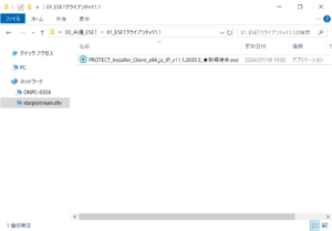 ①Driversフォルダ↓から、セットアップファイル(PROTECT_Installer_Client_x64_ja_JP_v11.1.2039.3_★新規端末.exe)をローカルへコピーする。